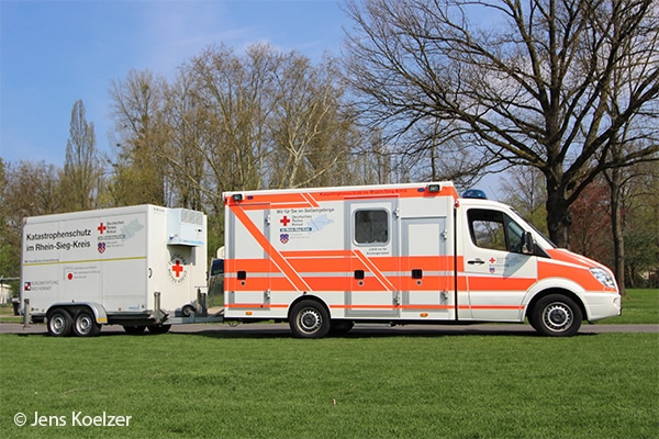 Fahrzeugtyp: Gerätewagen (GW) Verpflegung, vormals Rettungswagen (RTW) nach DIN EN 1789, Typ C, Fahrgestell: Mercedes Sprinter 416 CDI in Niederflurbauweise, Motor: Leistung: 120 kW/163 PS bei 3.800/min, Hubraum: 2.143 cm3, Drehmoment: 360 Nm bei 1.400-2.400/min, Antrieb: Hinterradantrieb, Getriebe: Automatikgetriebe, Maße/Gewichte: Länge: 6.700 mm, Breite: 2.360 mm, Höhe: 2.700 mm, Leermasse: 3.500 kg, zulässige Gesamtmasse: 3.880 kg, fahrzeugtechnische Ausstattung: ABS, ESP, ASR, Umfeldbeleuchtung, Rückfahrkamera, Warnbalken Hella RTK 5, Digital- und Analogfunk Festeinbau, 2-Meter-Handfunkgerät, HRT, Wetterschutz am Heck (Plane einziehbar), interne Stromumwandlung 230 V bei rund 3.000 W, externe Stromversorgung 230 V/16 A, Baujahr RTW: 2010, Umbaujahr GW Verpflegung: 2017, Auf-/Umbau: C. Miesen GmbH & Co. KG, Bonn, Kosten RTW: zirka 140.000 Euro, Kosten Umbau: zirka 18.000 Euro.