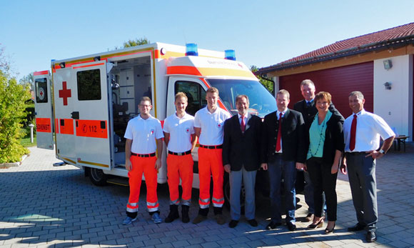 Eröffnung der neuen Wache in Oberhaching: Thomas Wagmüller (stellver. Leiter des Deisenhofener Roten Kreuzes), Sabine Wagmüller (stellver. Vorsitzende des Münchner Roten Kreuzes), Bürgermeister Stefan Schelle, Sönke Lase (Leiter Rettungsdienst des Münchner Roten Kreuzes), Roland Dollmeier (Geschäftsführer des Rettungszweckverbandes München) und drei Mitarbeiter der Stammbesatzung. Foto: Gabriel Bücherl/BRK