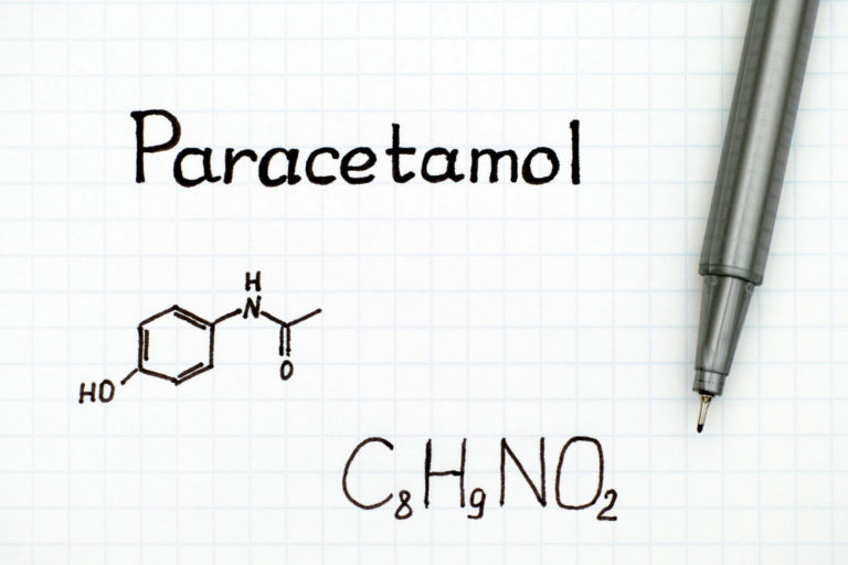 Chemical formula of Paracetamol with black pen. Close-up.